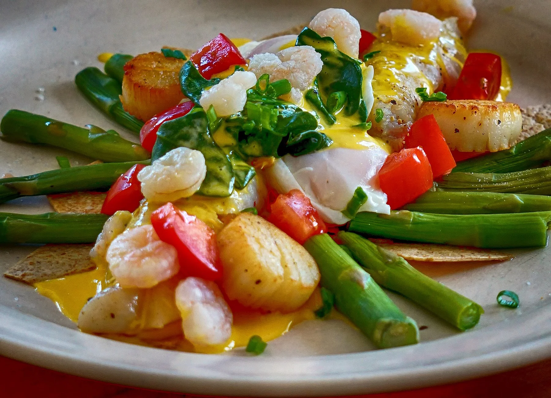 Okay, I got carried away this morning. I had some spears with no tips, so how do I make breakfast from them? Scallop season is almost over, and I just got 5 lbs from the Rimrack at the dock. Why not add some Atlantic Ocean Perch, Gulf Shimp, hand toasted whole wheat tortillas, spinach, Jennifer's poached hen's eggs with my own recipe Duck Hollandaise (Austin's own Salt Lick for kick), toms for color balance, and scallions for zip? I need to hire someone to clean the kitchen while I grind, price and pack for today's client pick up.